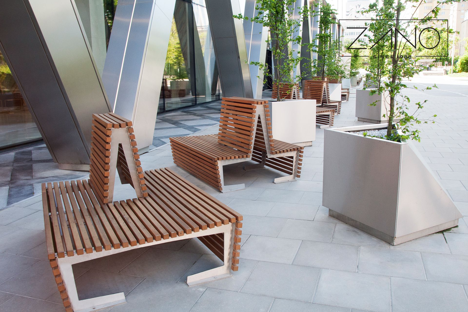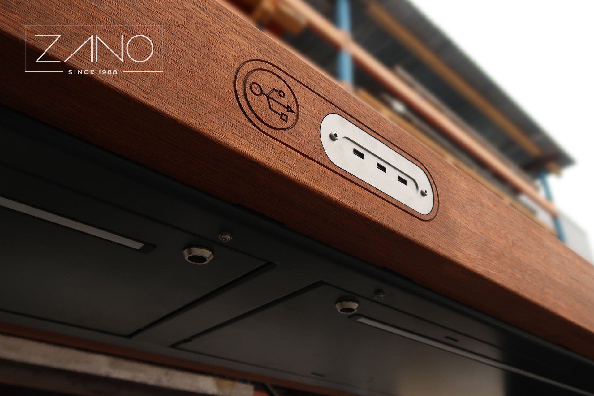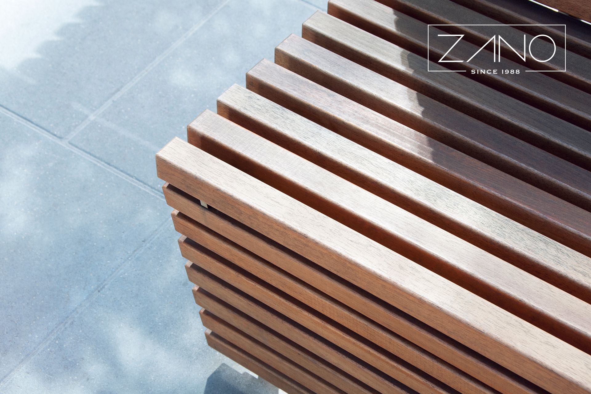 Unten wird die Photon-Sonnenbank in einer Version aus Kohlenstoffstahl in der Farbe 9006 RAL und aus heimischem Nadelholz in der Farbe "Nussbaum" vorgestellt. Das letzte Foto zeigt die Photon-Bank mit Holz in der Farbe "Nussbaum" und Stahl lackiert in 7021 RAL - dunkelgrafit.