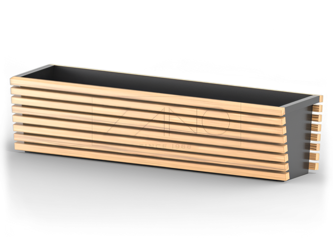 Die Pflanzkübel der Produktreihe Flash stechen von den anderen Modellen durch ihr charakteristisches Aussehen und ihre Form heraus – einer umgekehrten stumpfen Pyramide. Die Grundfläche besteht aus einer Stahlkonstruktion, die mit hölzernen Leisten an den Seitenflächen ergänzt wird. Insgesamt sind es 16 Leisten. Zwischen den Leisten sind kleine Lücken, wodurch das Design viel leichter erscheint. Im oberen Teil der kürzeren Seitenwände des Pflanzkübeln ohne Holzverkleidung wurde ein gerolltes Blech angebracht, das das Greifen des Produktes und das Verschieben an einen anderen Ort erleichtert. Der Boden ist mit einer Öffnung für den Wasserabfluss versehen. Die Höhe aller Kübel wurde vereinheitlicht. Das Gleiche gilt für ihre Breite. Es sind 4 verschiedene Längen erhältlich. Es kann Edelstahl oder Baustahl verwendet werden.