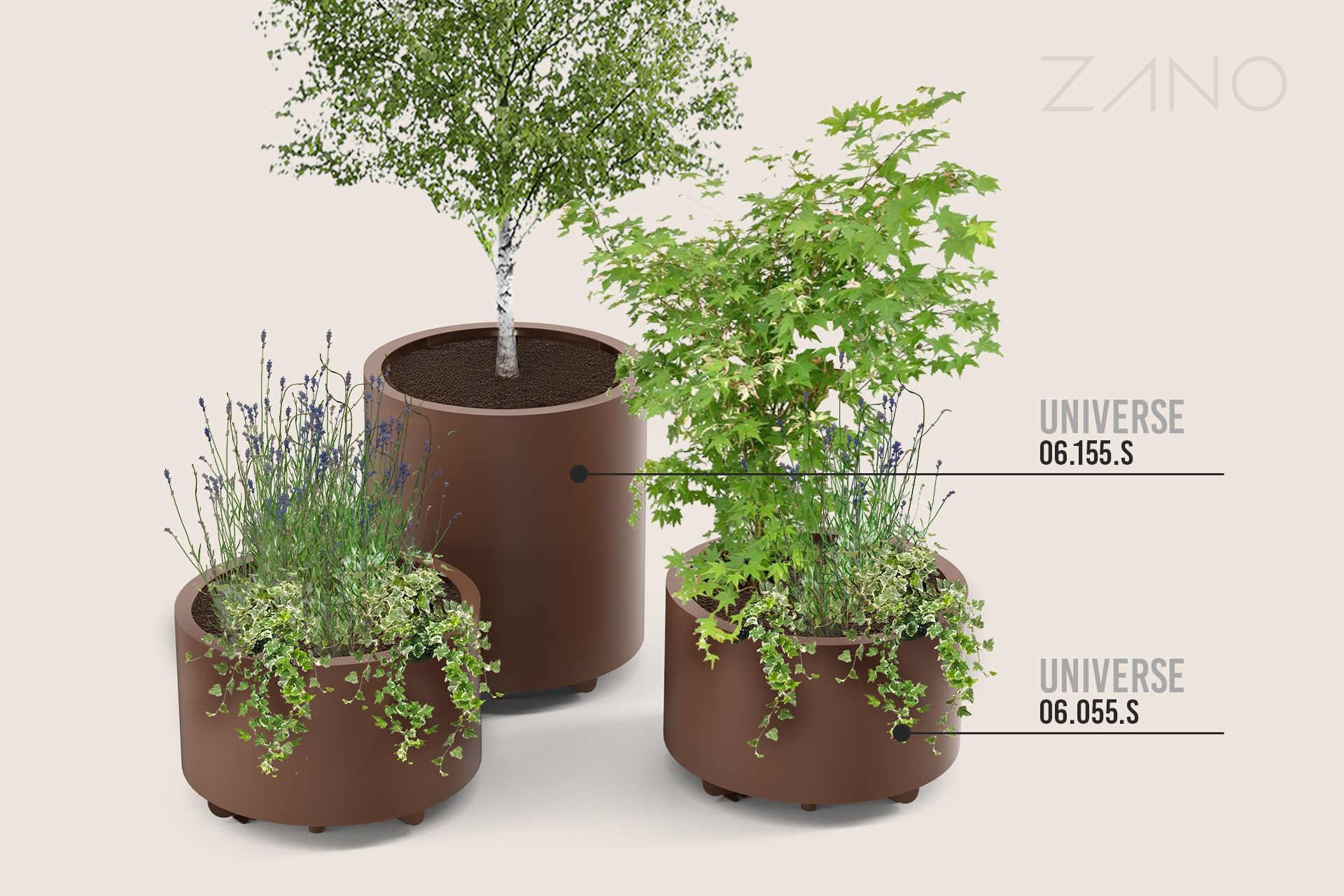 Die Universe Pflanzkübel sind in vier Größen: S-XL verfügbar. Sie werden wahlweise aus Edelstahl oder aus Karbonstahl hergestellt. Karbonstahl wird zusätzlich verzinkt und in einer beliebigen RAL Farbe Ihrer Wahl pulverbeschichtet. Die Höhe der Pflanzkübel entspricht auch der Höhe der Universe Sitzbänke.